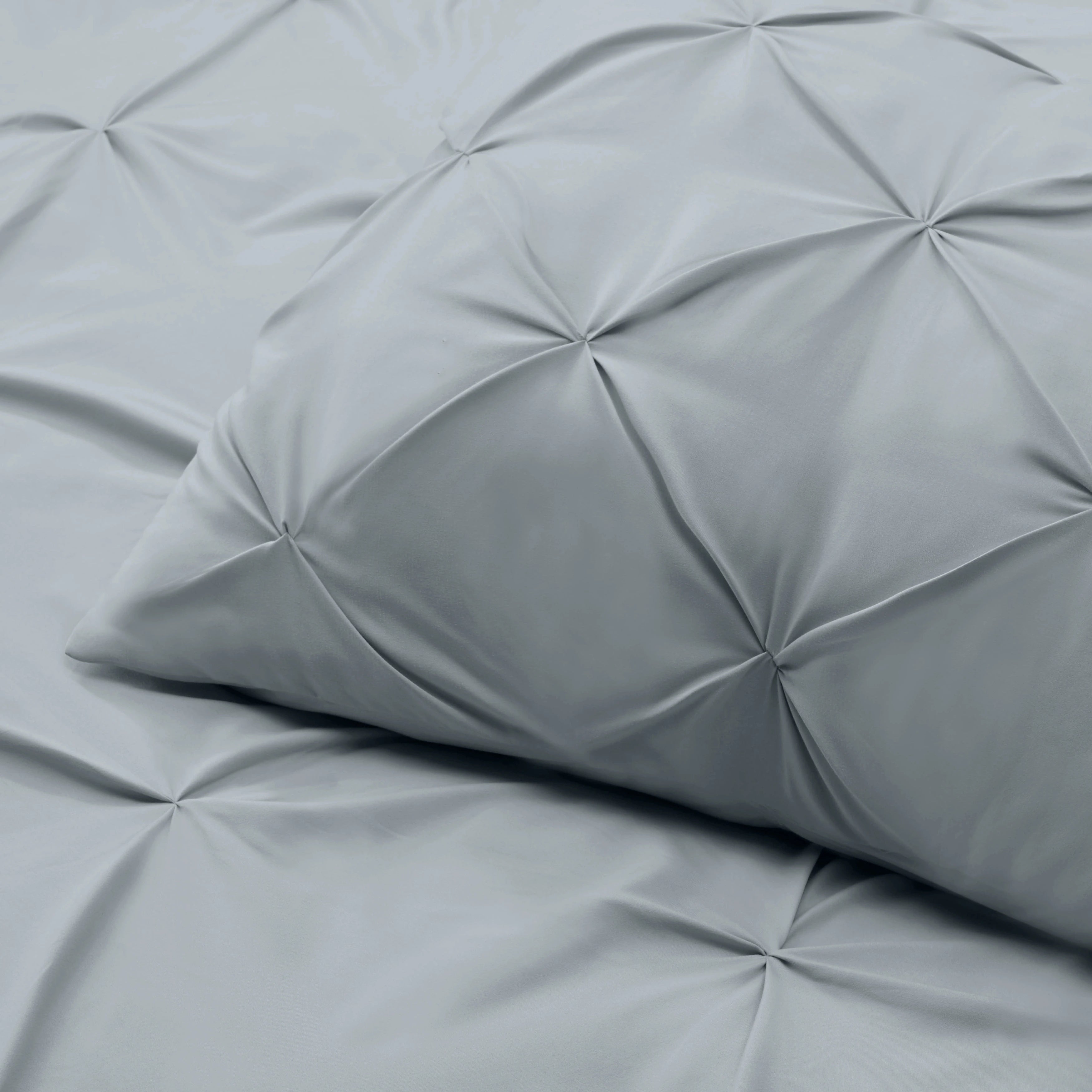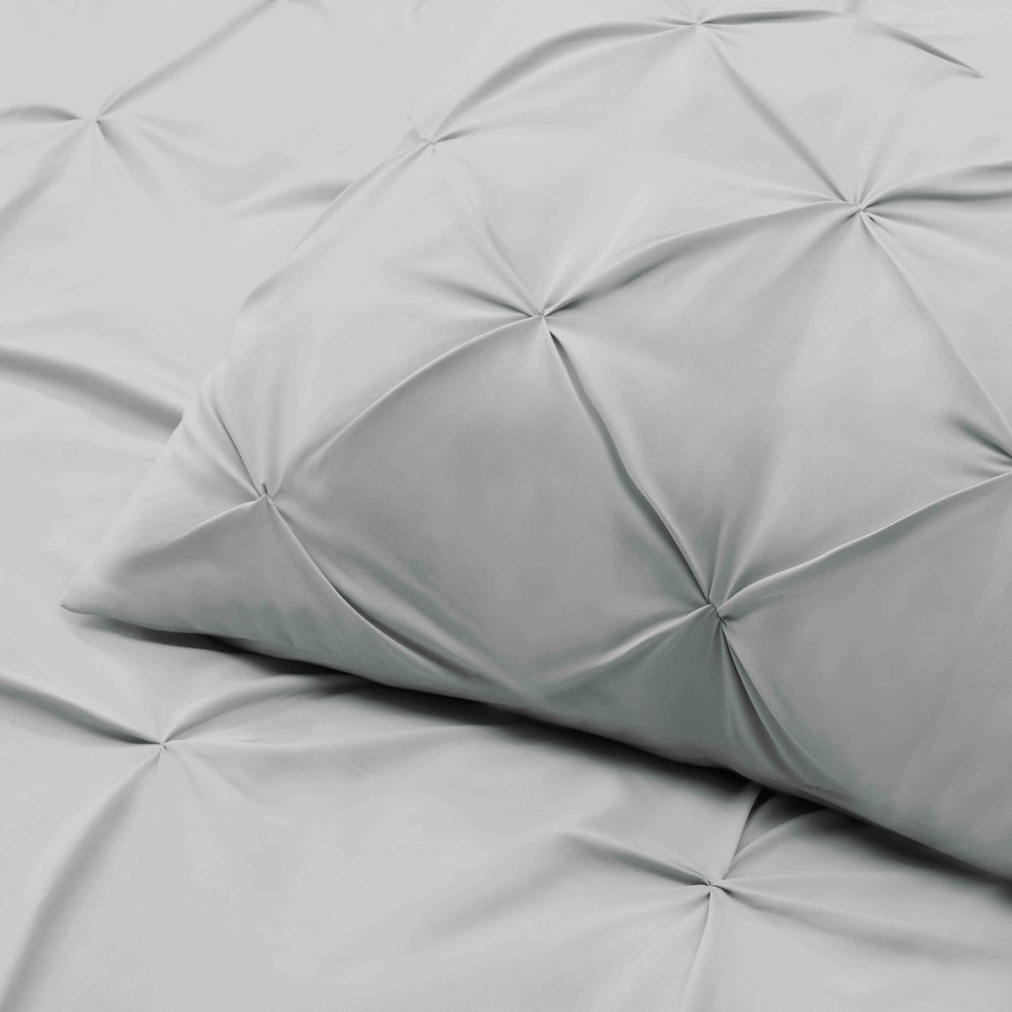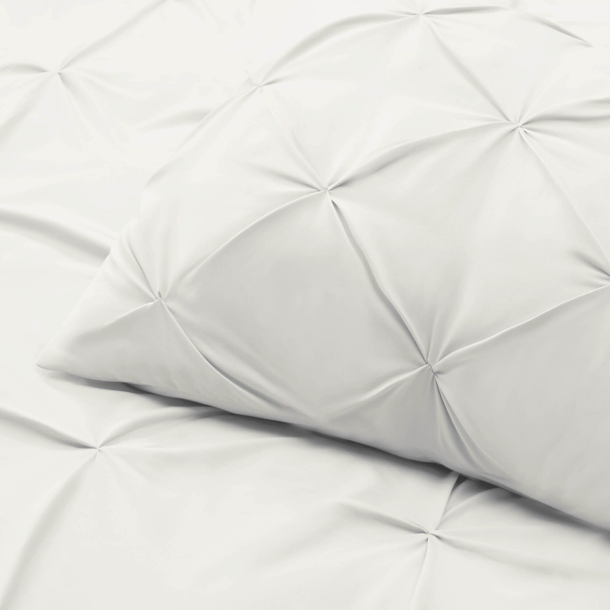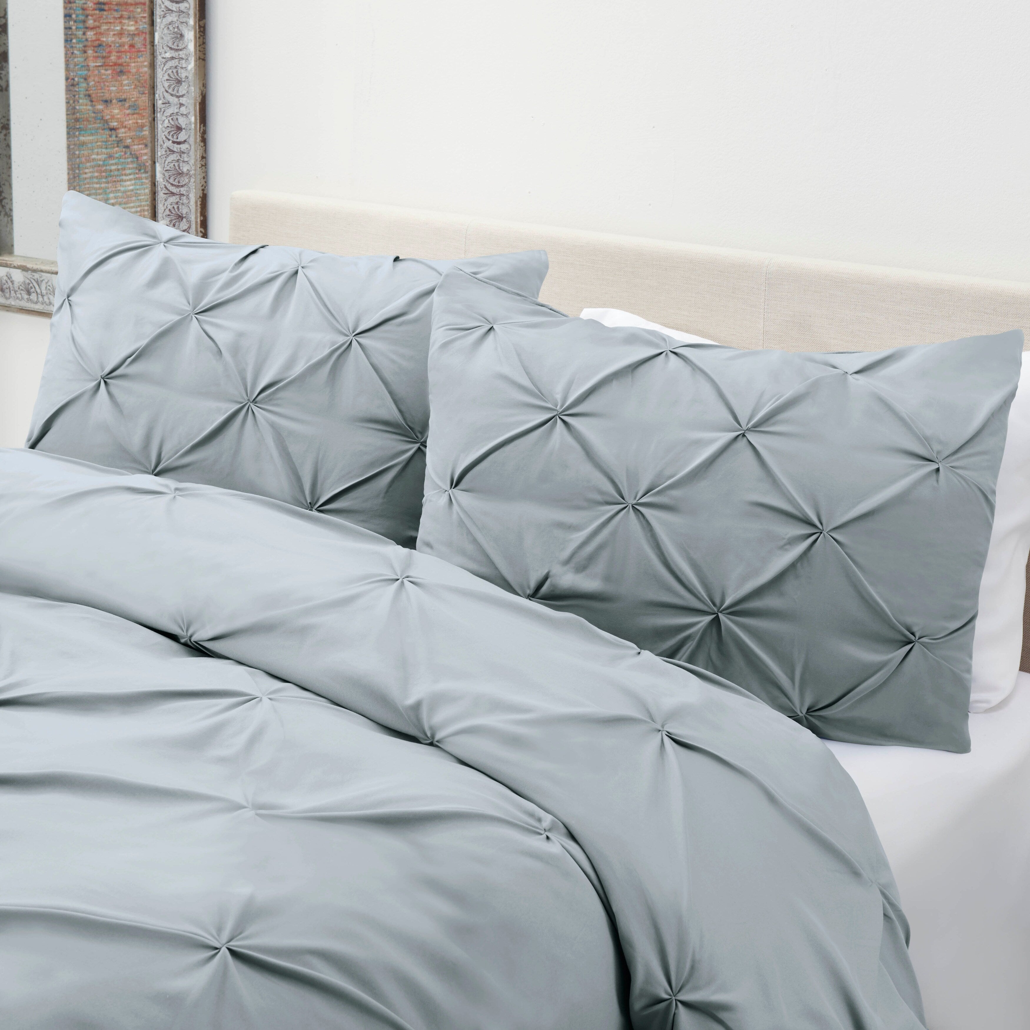 Upgrade your bedroom with the Nestl Pinch Pleat 3-piece Duvet Cover Set. The breathable and cool microfiber bedding provides a luxurious sleeping experience, thanks to its silky soft feel and tight, double-brushed weave. This set comes with one duvet cover, two pillowcases (one in twin set), and features an elegant pinch pleat design with attached ties and large button closures. It's pet-friendly and prevents dust mites, hair, and dander. Choose from a variety of colors to refresh your bedroom decor.