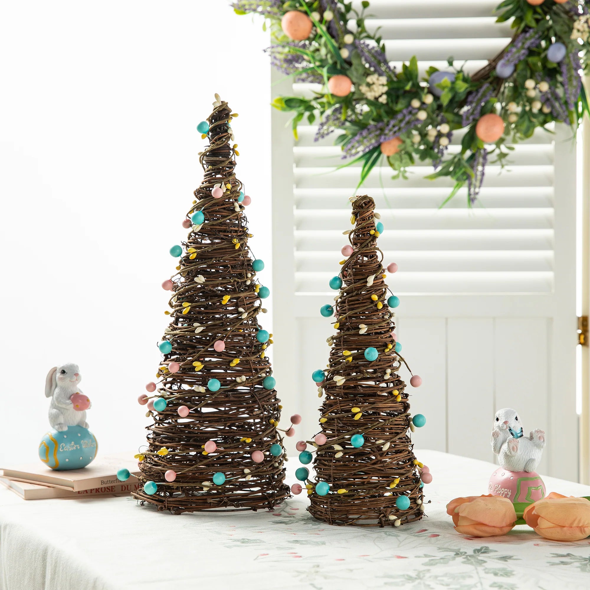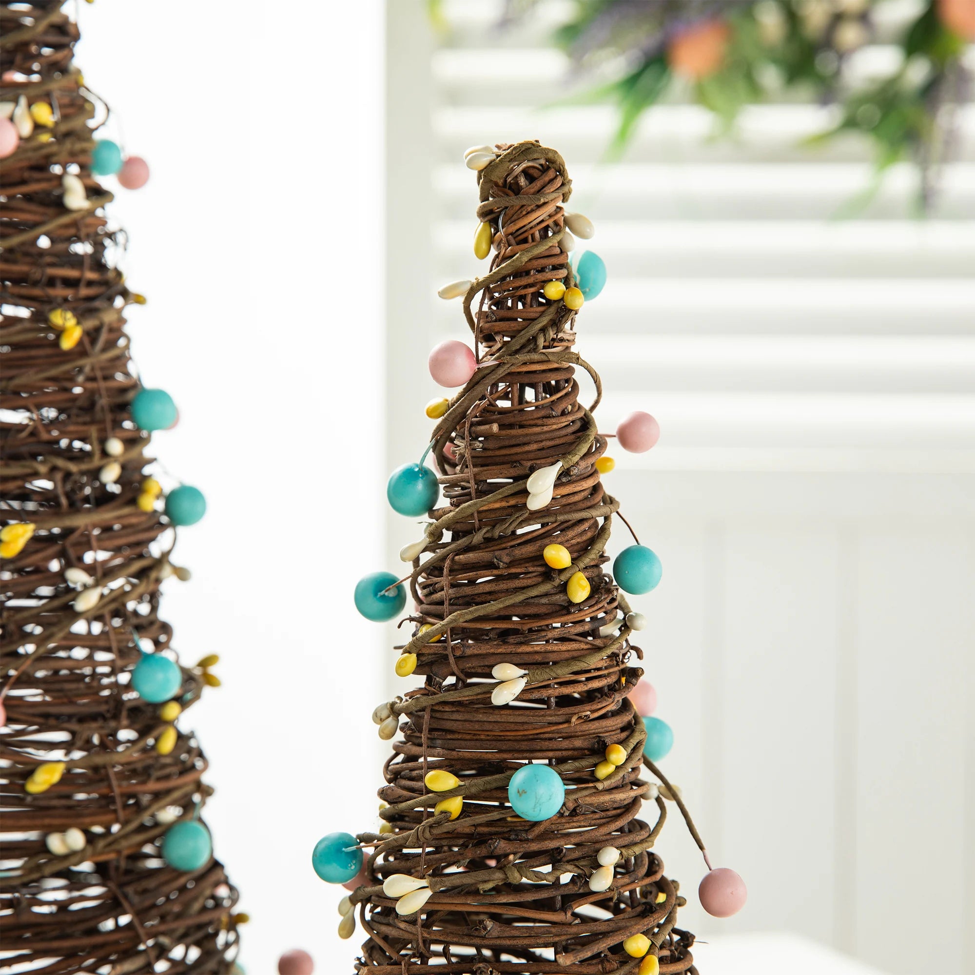 This is a nature-inspired Grapevine Twig Cone Tree with pink and blue berry balls. Display this anywhere in your home that you see fit. Because of its small size, it can serve as a centerpiece on tables and desks, or as a lovely accompaniment on the ledge of the fireplace. Even place it on the ground of your foyer, living room, or family room.