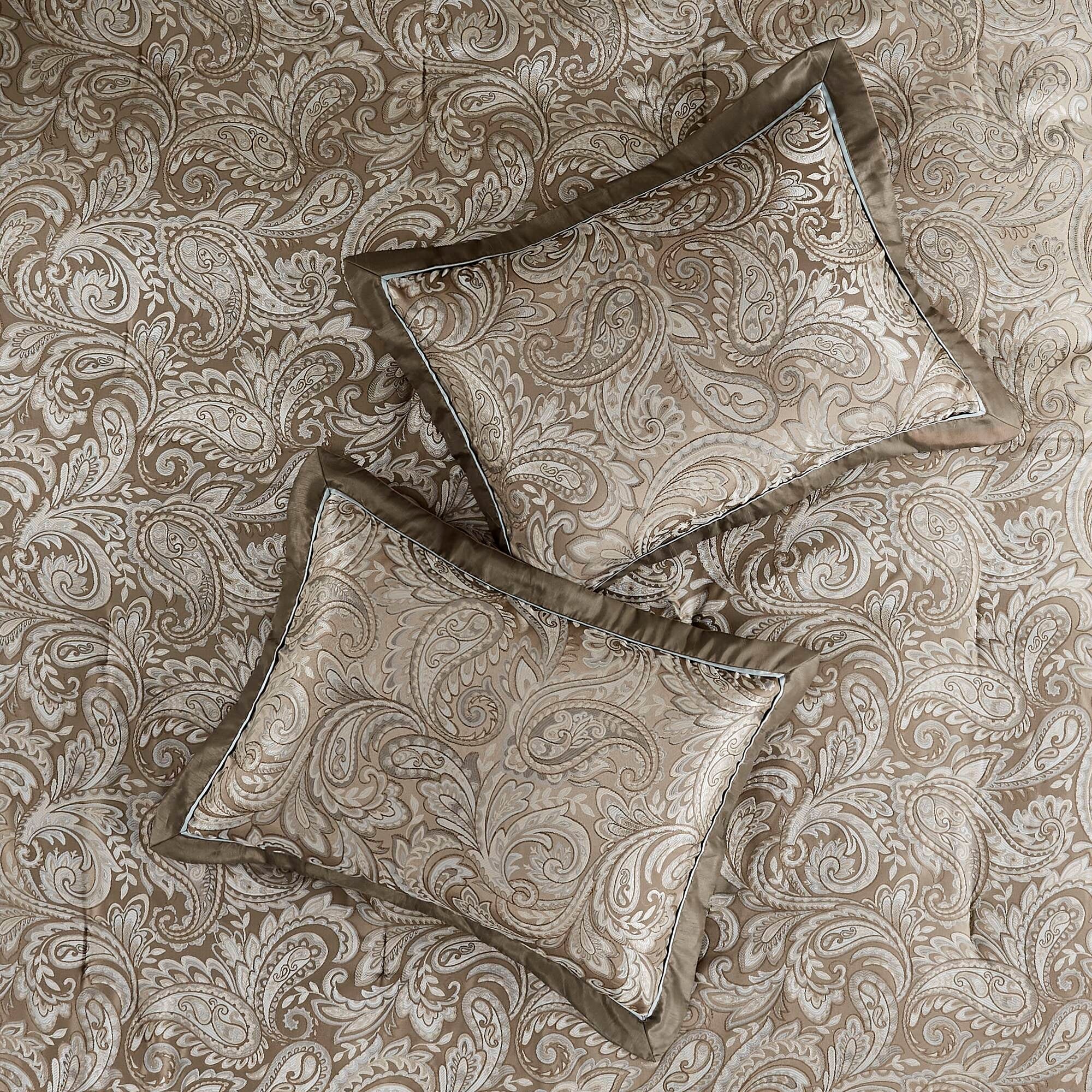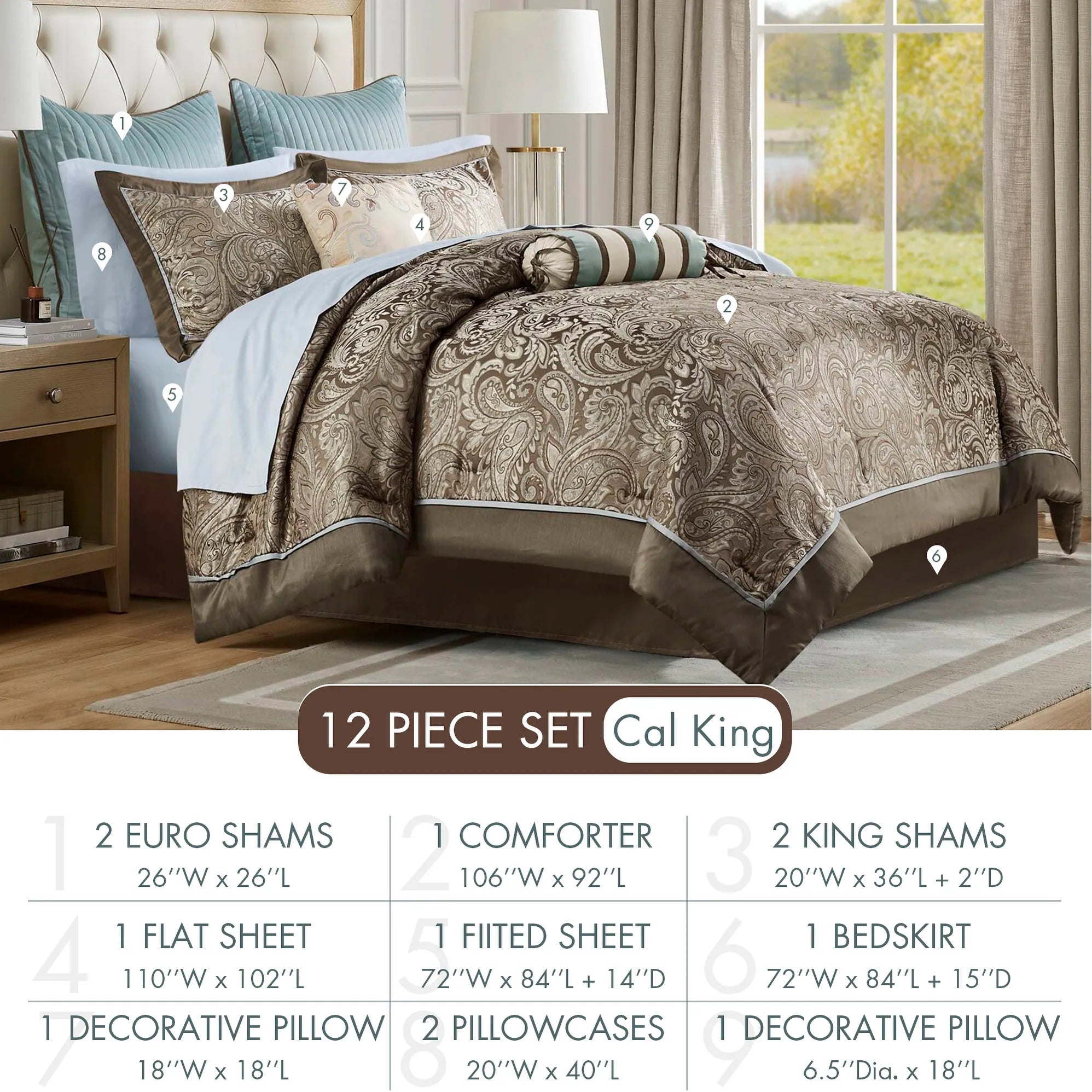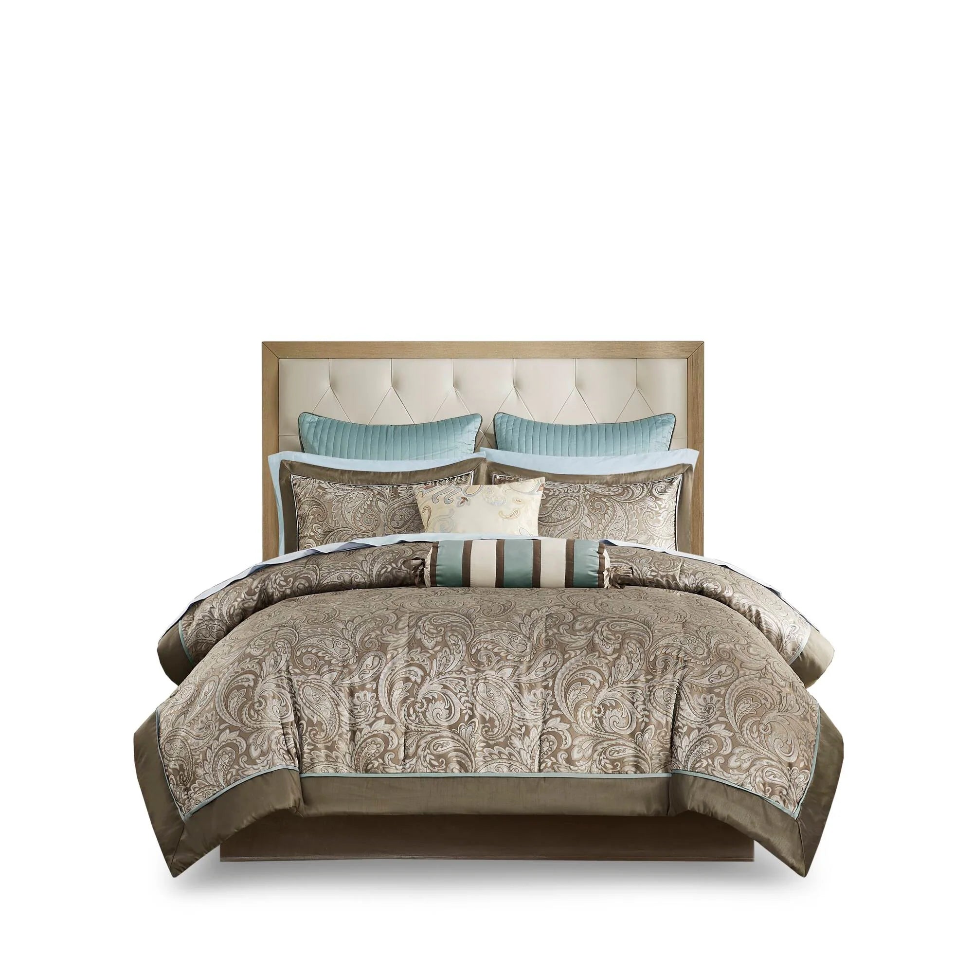 Give your bedroom a classic and elegant look with the Madison Park Whitman 12 Piece Complete Bed Set including cotton bed sheets. This stunning set features a jacquard weave with a modern paisley pattern in soft blue, taupe, and a hint of platinum for a touch of sheen to your bedding. The set also includes a 100% cotton sheet set.
