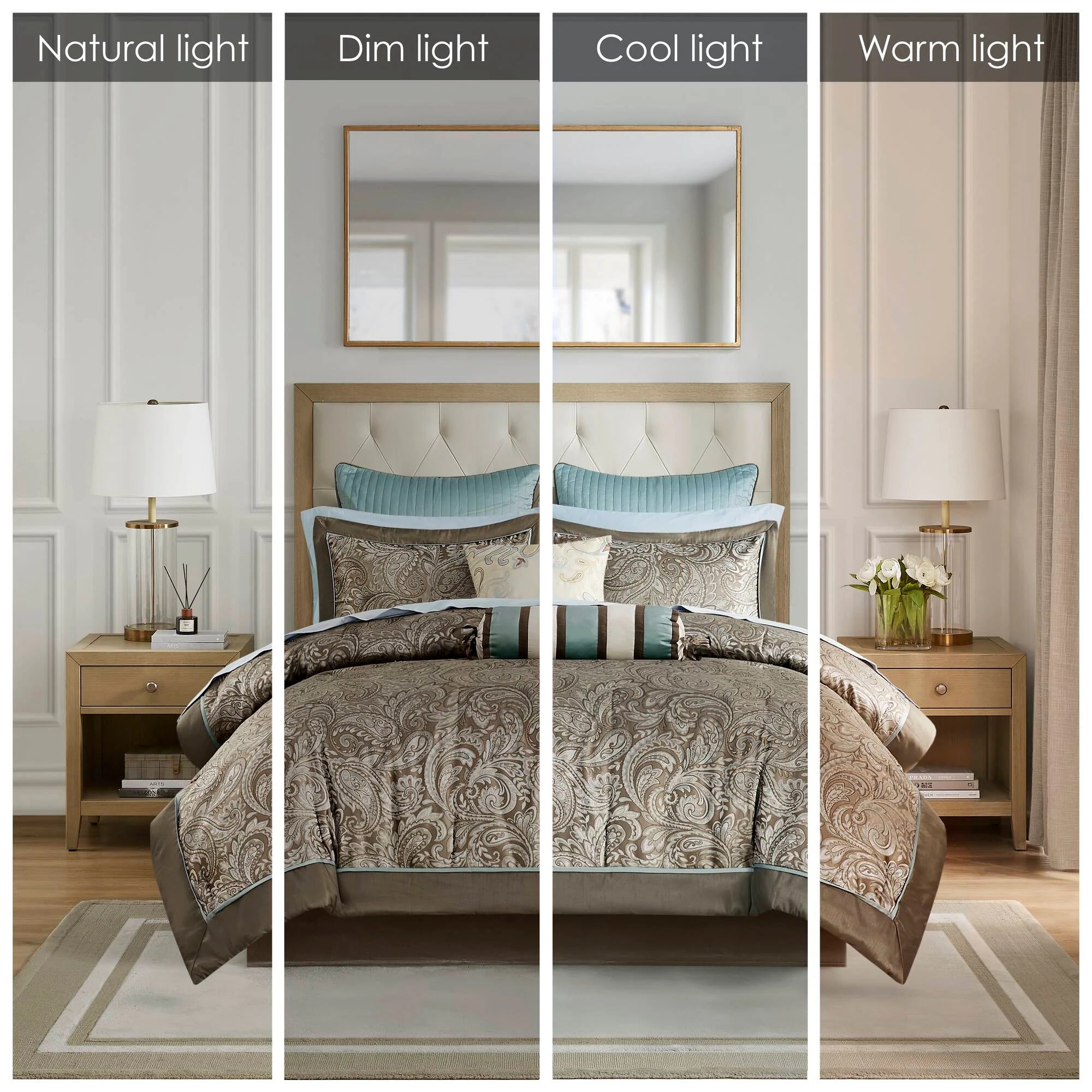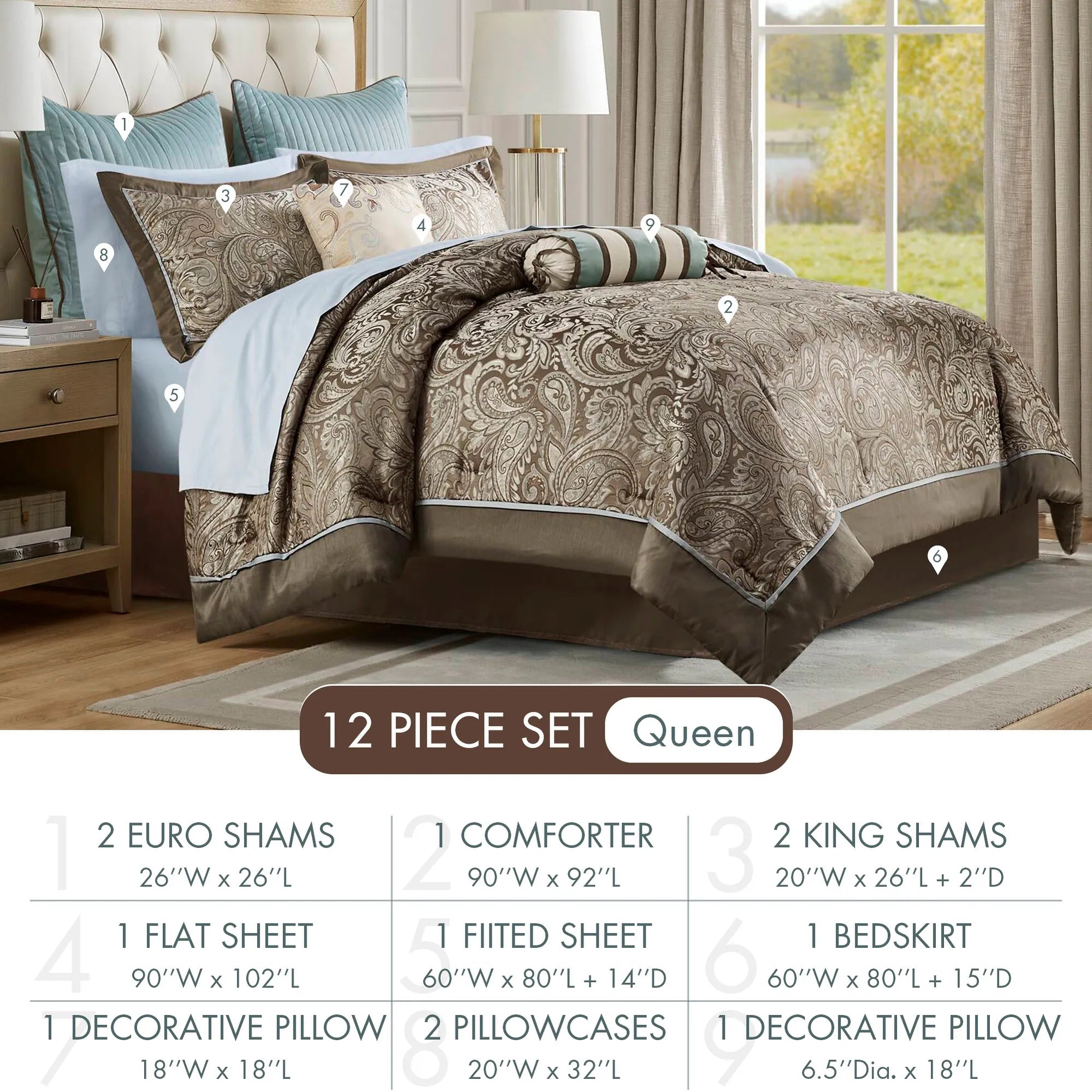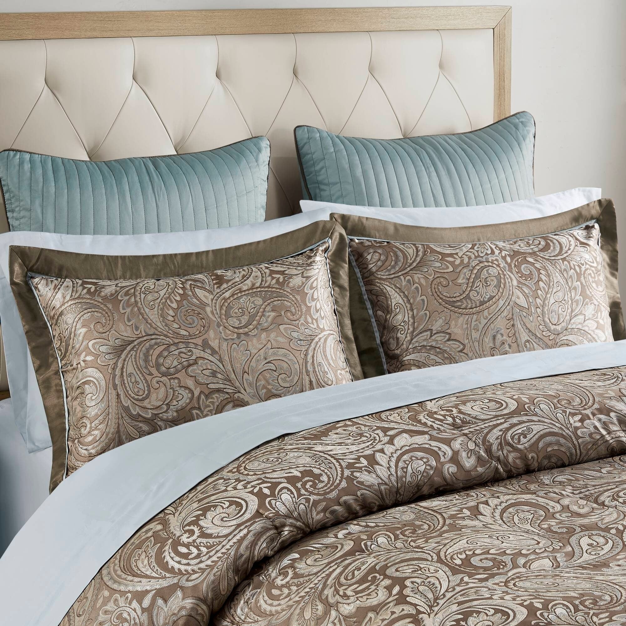 Give your bedroom a classic and elegant look with the Madison Park Whitman 12 Piece Complete Bed Set including cotton bed sheets. This stunning set features a jacquard weave with a modern paisley pattern in soft blue, taupe, and a hint of platinum for a touch of sheen to your bedding. The set also includes a 100% cotton sheet set.